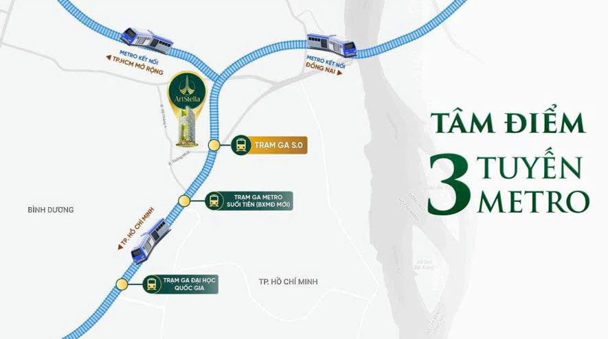 Art Stella tọa lạc tại mặt tiền đường Thống Nhất, phường Đông Hòa, khu vực chiến lược nằm trong tam giác vàng giữa ba trung tâm kinh tế lớn: TP. Thủ Đức (TP.HCM), TP. Biên Hòa (Đồng Nai) và Dĩ An (Bình Dương cũ). Từ vị trí này, cư dân dễ dàng kết nối với các tuyến giao thông huyết mạch như Xa lộ Hà Nội, Quốc lộ 1K, và đặc biệt chỉ cách đối diện Bến xe Miền Đông mới và gần ga Metro số 1– những điểm nút quan trọng trong hệ thống giao thông của vùng Đông Nam Bộ.
