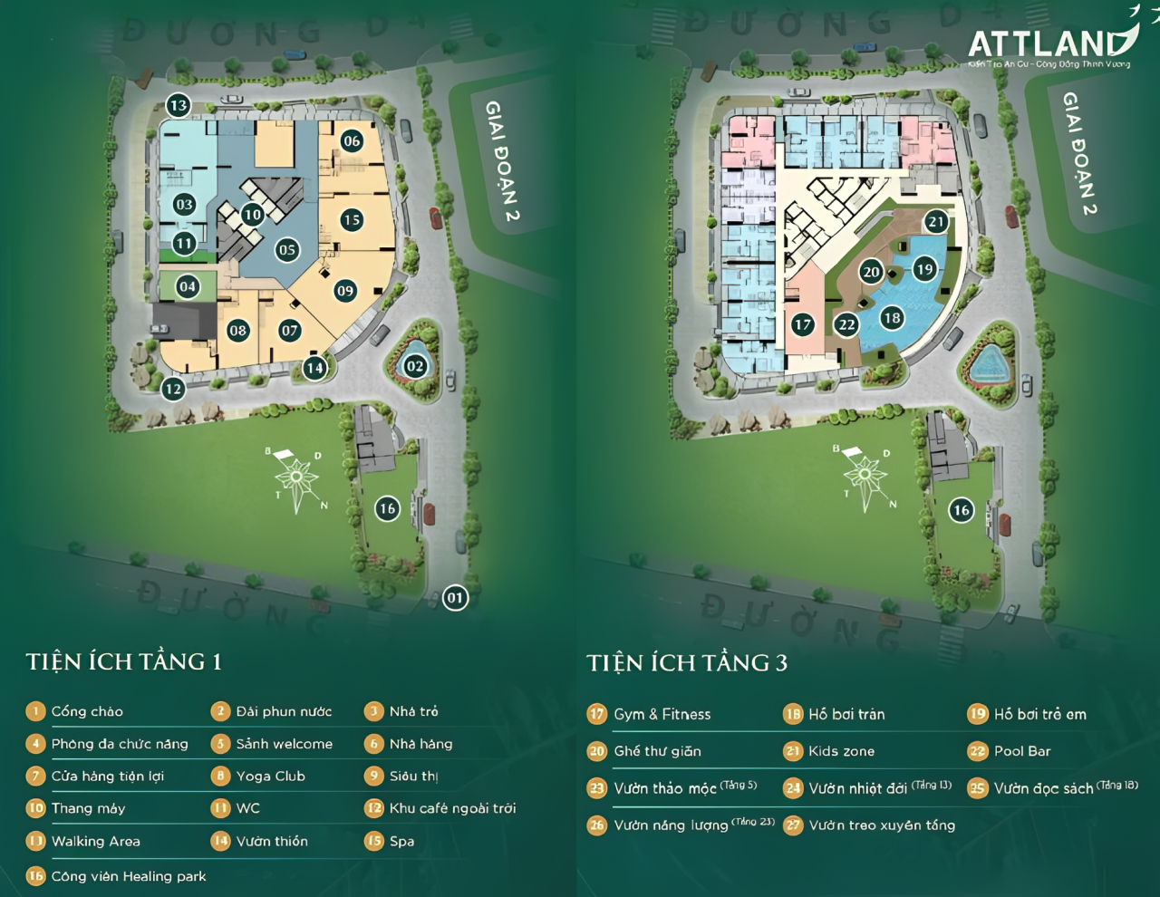 - Tầng 1: Công viên Healing Park, khu Yoga Club, nhà hàng, khu café ngoài trời, phòng chức năng, siêu thị, spa, sân vườn thiền và khu vực đi bộ thư giãn.