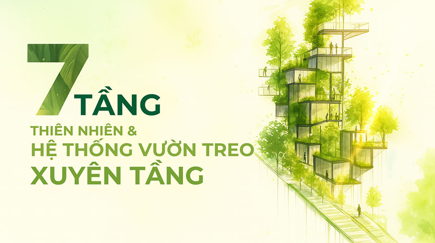 - Ngoài ra còn có vườn treo xuyên tầng kết nối các khu chức năng xanh, tạo nên trải nghiệm sống gần gũi thiên nhiên mọi lúc, mọi nơi.